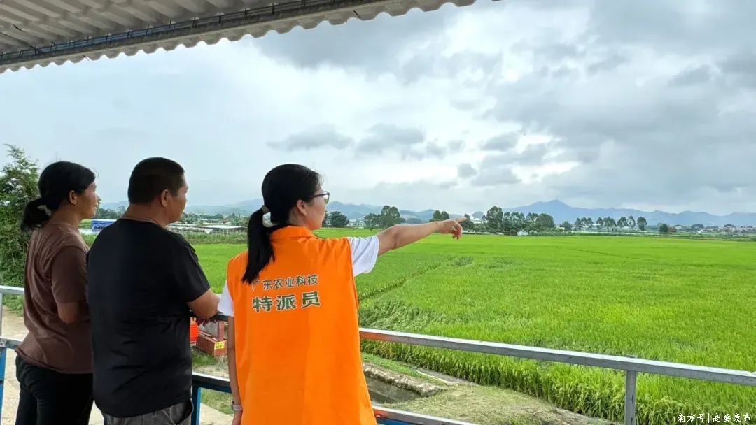 ▲ 6月17日,高要区农业科技特派员到新桥镇珠江村水稻绿色高产高效行动示范片,了解水稻生产情况,指导农户做好雨后田间管理。林茵红 摄